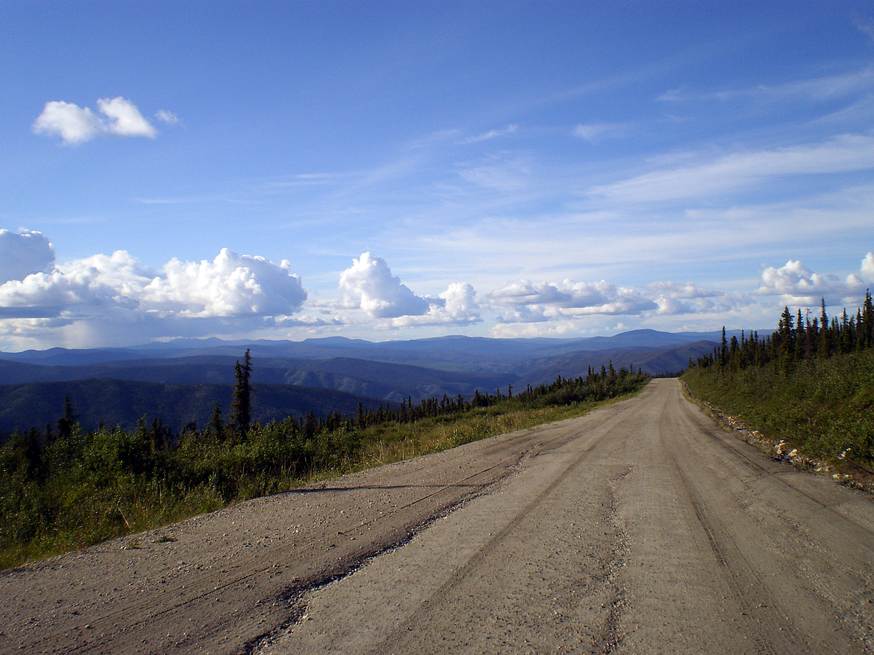 A travessia pela Top of the World Highway faz jus ao nome: uma estrada que serpenteia por cumes e oferece vistas surreais, como se você estivesse no topo do mundo. Ao cruzar a fronteira em Little Gold Camp, o cenário continua a impressionar até a chegada a Dawson City.